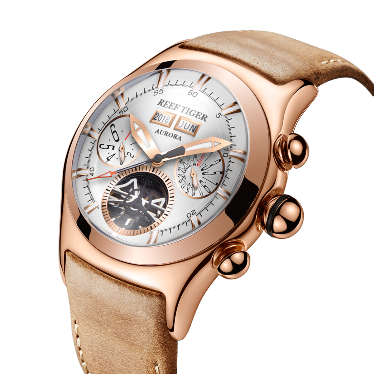Aurora Ari Bubble II 玫瑰金鏤空腕表。耐用的不銹鋼鍍玫瑰金,固定表圈也適合打造專業(yè)的提案和演示。耐用的聚酯前后蓋,協(xié)調(diào)一致。