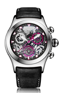 鏤空表盤配有三個子表盤。計時碼表、小時、分鐘、秒和日期顯示。這款時尚的男士手表在表盤 12 點鐘位置印有其標(biāo)志。