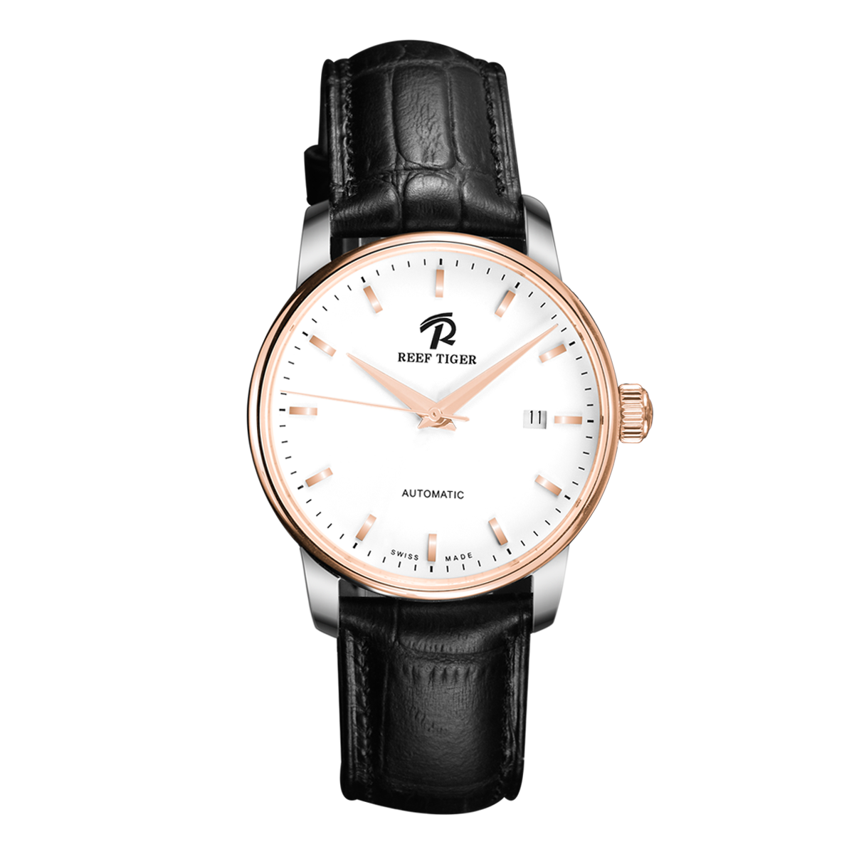 白色表盤。這款雙色手表采用經(jīng)典的圓形表殼,搭配黑色表盤(玫瑰金條形刻度)和日期功能,非常適合男士佩戴。