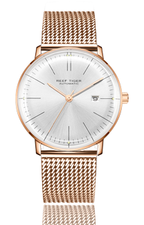 Reef Tiger 經(jīng)典傳奇腕表。耐用的玫瑰金表圈,還配有玫瑰金表圈,打造專業(yè)的提案和演示。耐用的聚酯前后蓋,協(xié)調(diào)一致。
