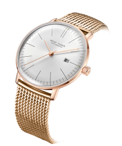 白色表盤,帶棒狀標(biāo)記。時、分、秒和日期顯示。這款奢華腕表的表盤 12 點鐘位置印有品牌標(biāo)識。