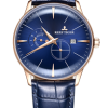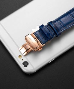 白色表盤,帶棒狀標(biāo)記。時、分、秒和日期顯示。這款奢華腕表的表盤 1 點鐘位置印有品牌標(biāo)識。