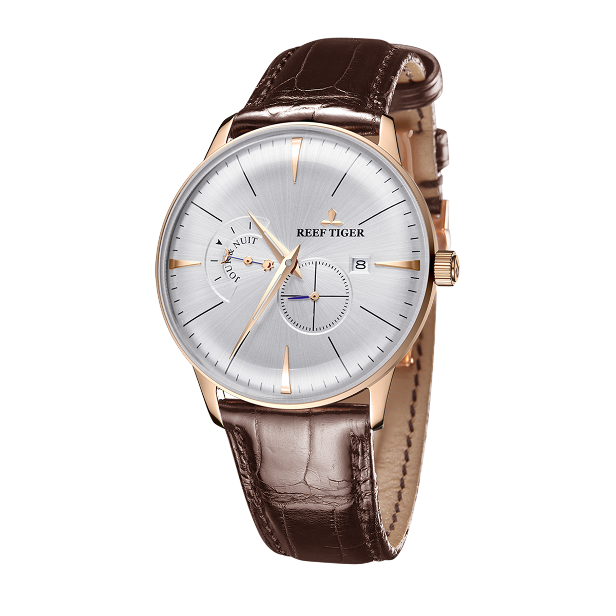Reef Tiger 經(jīng)典工匠腕表。耐用的玫瑰金表圈,還配有玫瑰金表圈,打造專業(yè)的提案和演示。耐用的聚酯前后蓋,協(xié)調(diào)一致。