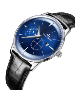 藍(lán)色表盤,帶棒狀標(biāo)記。時(shí)、分、秒和日期顯示。這款奢華腕表的表盤 1 點(diǎn)鐘位置印有品牌標(biāo)識(shí)。