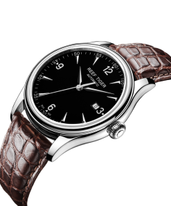 黑色表盤,帶銀色棒狀和羅馬數(shù)字標記。時、分、秒和日期顯示。