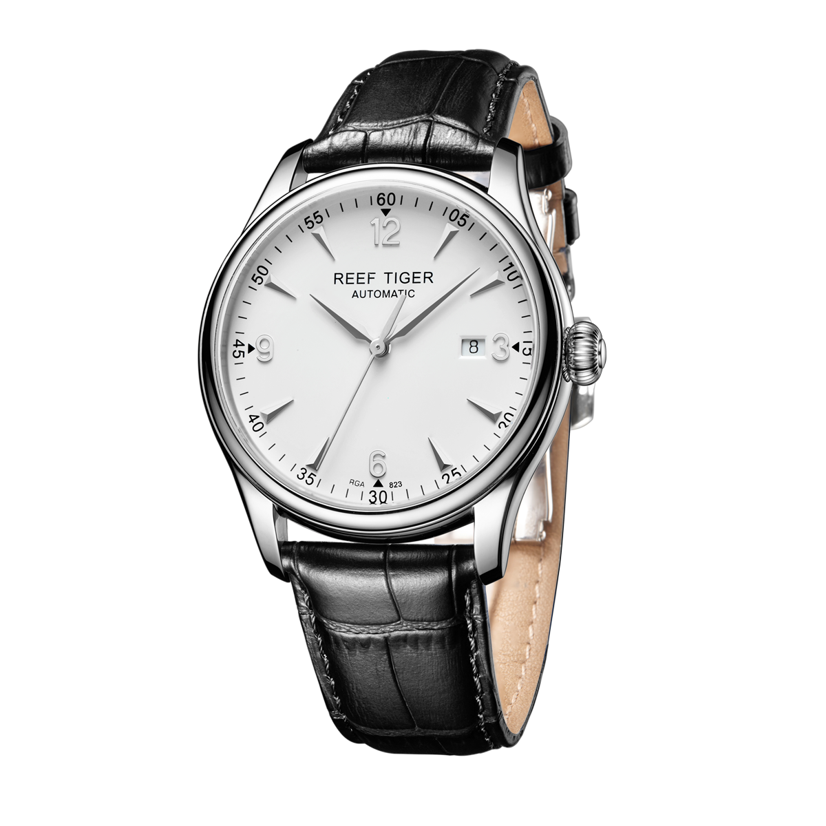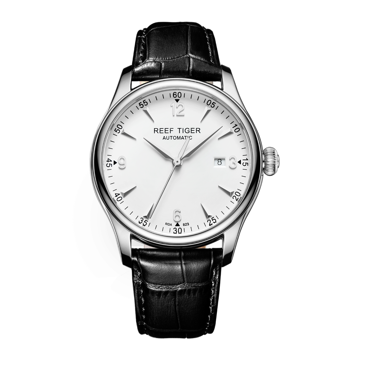 白色表盤,帶銀色棒狀和羅馬數(shù)字標記。時、分、秒和日期顯示。