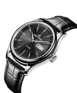 黑色表盤,配銀色棒狀和鉆石標記。小時、分鐘、秒、星期和日期顯示。