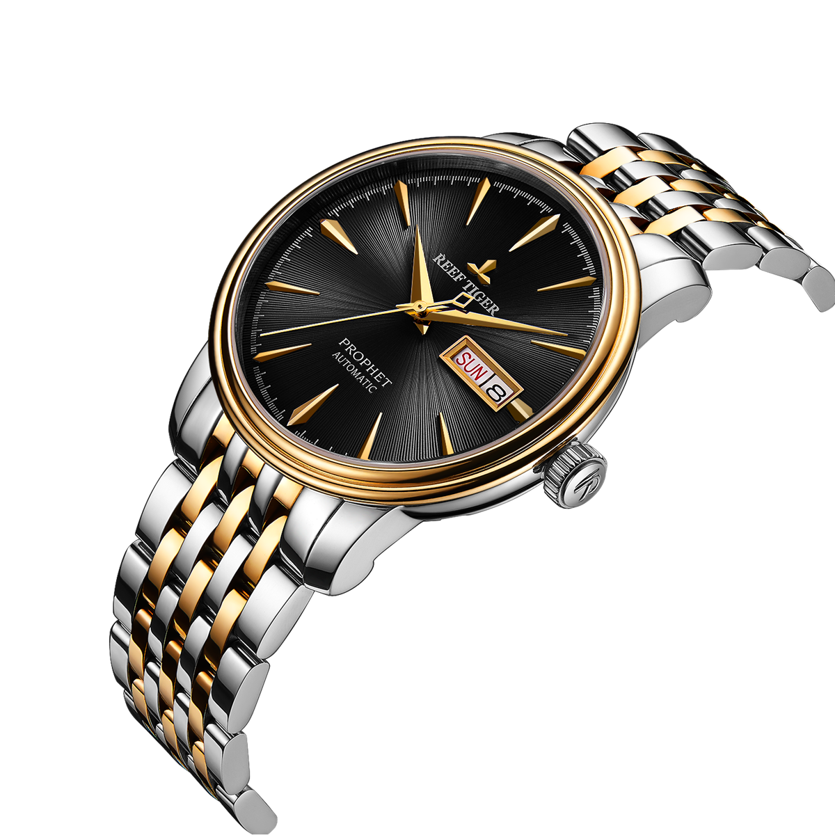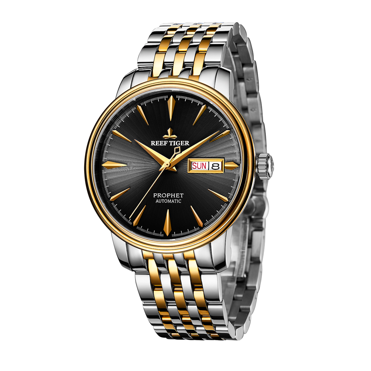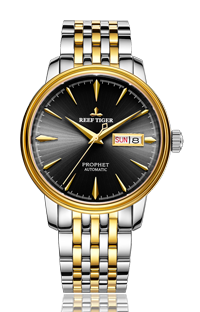 Reef Tiger 經(jīng)典 Prophet 腕表。耐用的不銹鋼黃金表圈也適合打造專業(yè)的提案和演示。耐用的聚酯前后蓋與協(xié)調(diào)。
