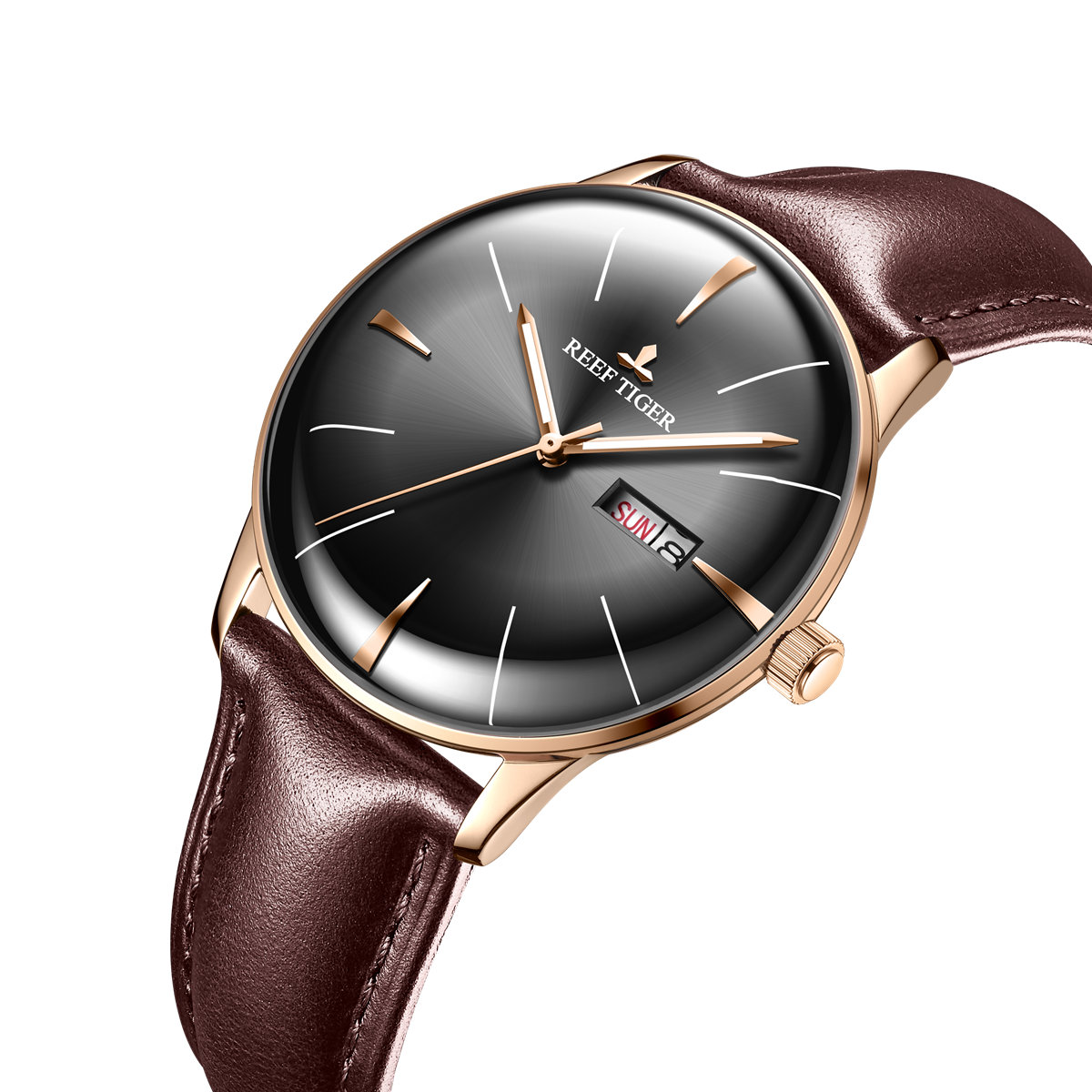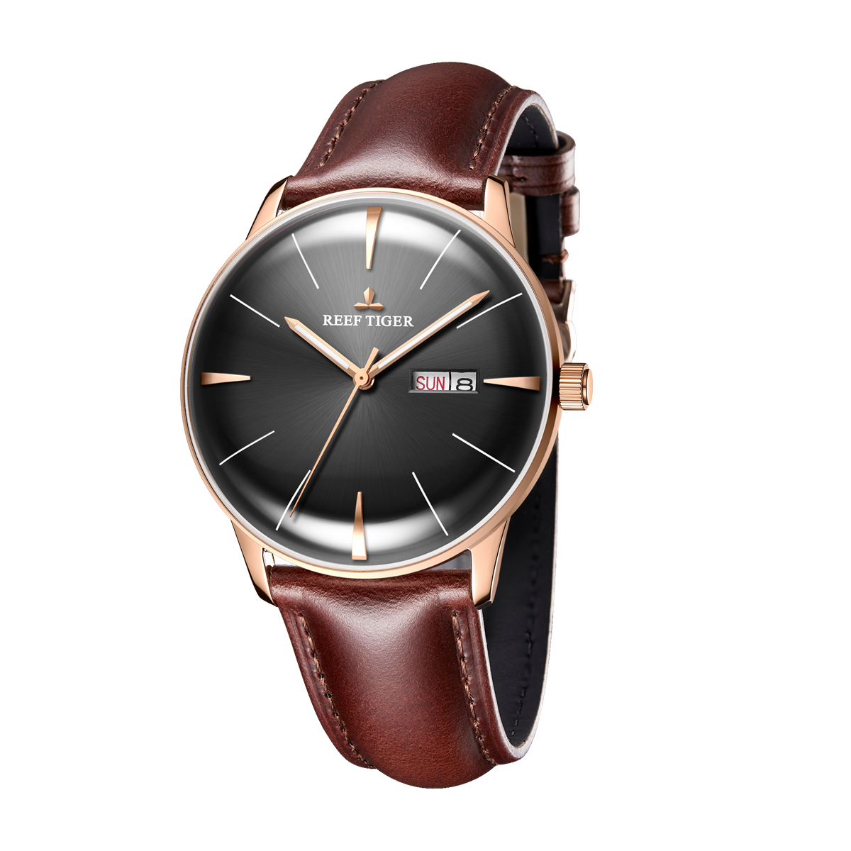 Reef Tiger 經(jīng)典 Heritor 腕表。耐用的不銹鋼玫瑰金表圈還配有可打造專業(yè)外觀的提案和演示。耐用的聚酯前后蓋與表盤相得益彰。