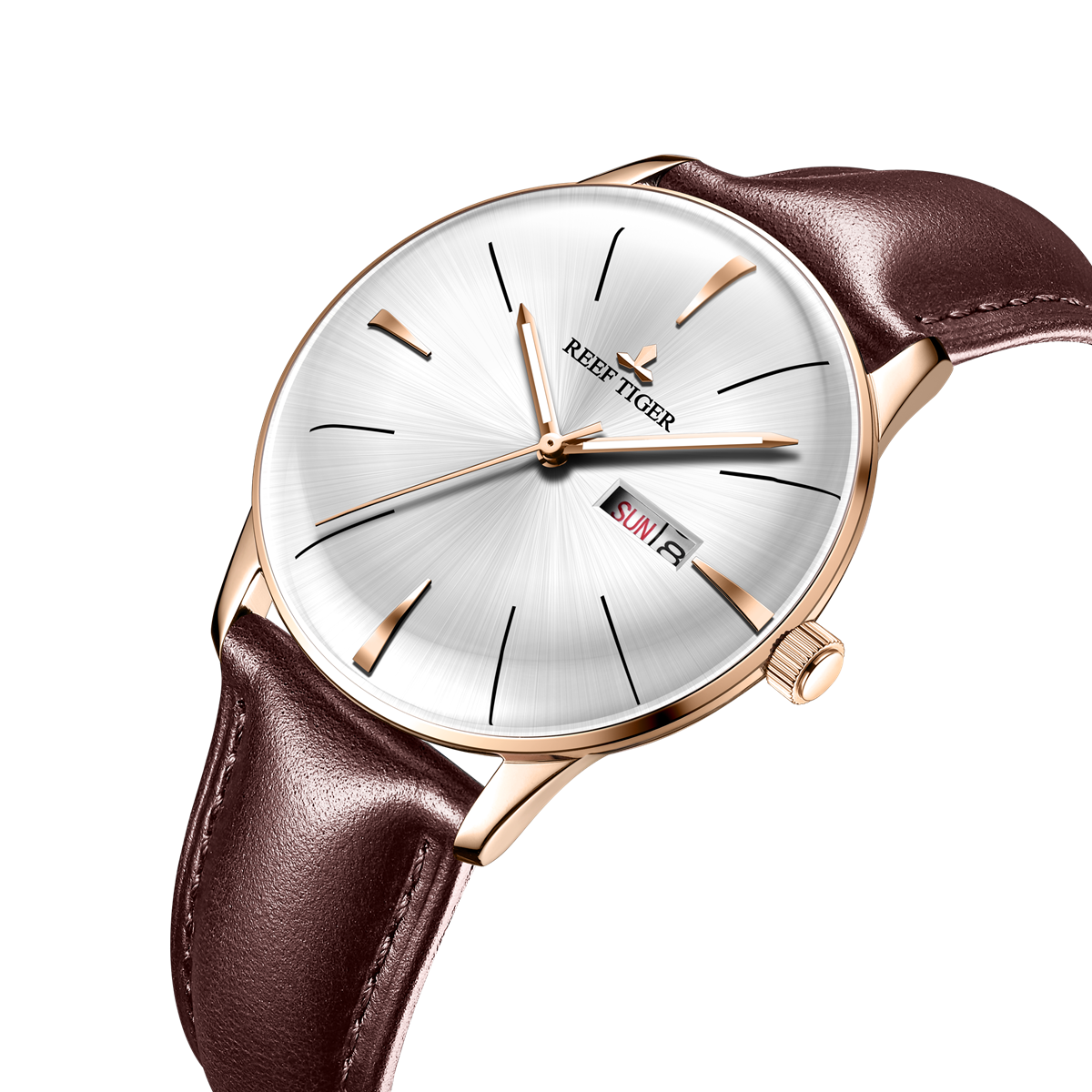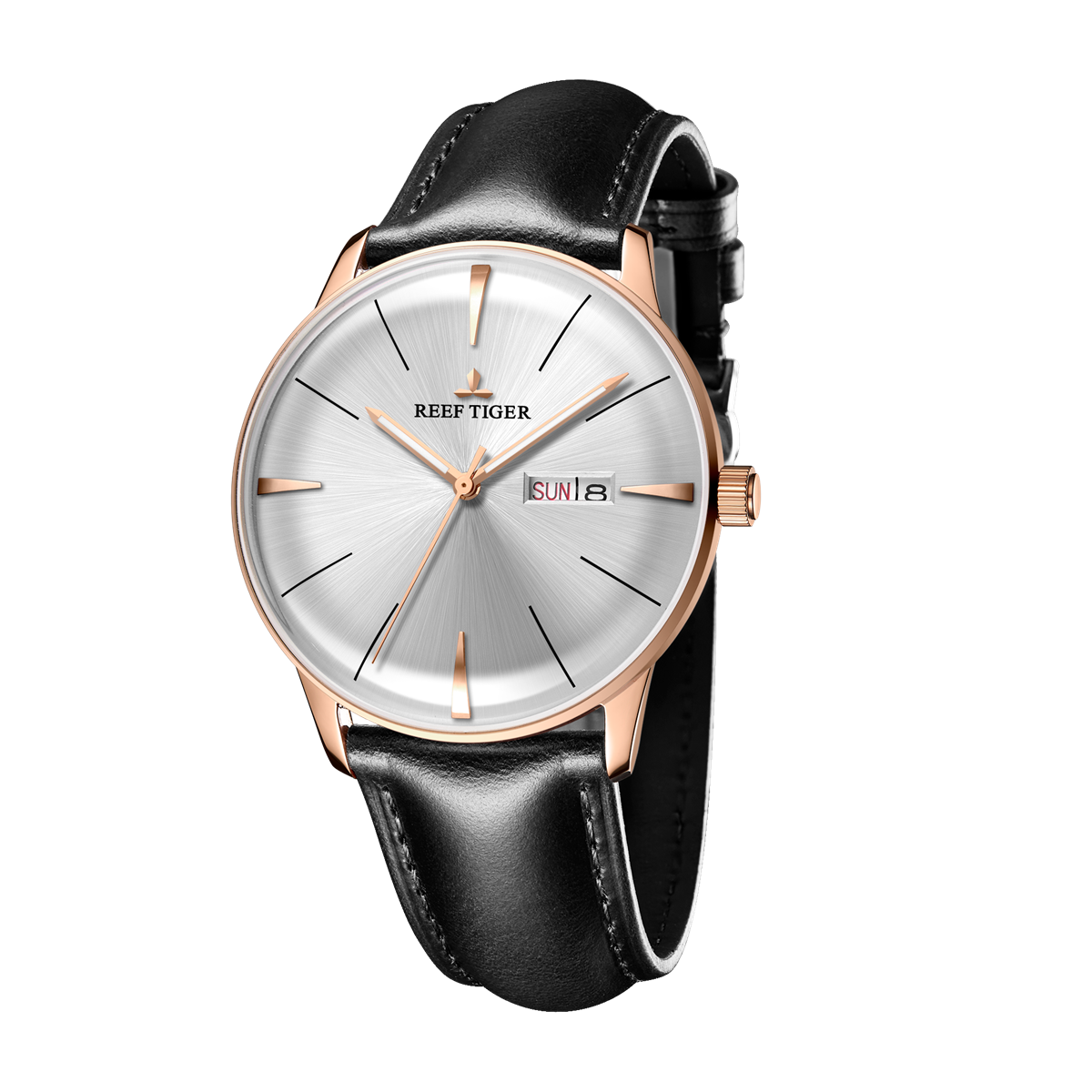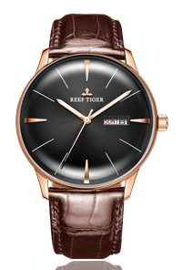 Reef Tiger 經(jīng)典 Heritor 腕表。耐用的不銹鋼玫瑰金表圈還配有可打造專(zhuān)業(yè)外觀的提案和演示。耐用的聚酯前后蓋與協(xié)調(diào)。