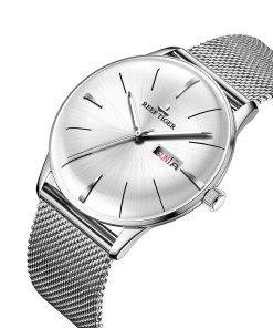 白色表盤,帶棒狀標(biāo)記。時(shí)、分、秒和日期顯示。這款奢華腕表的表盤 12 點(diǎn)鐘位置印有品牌標(biāo)識(shí)。