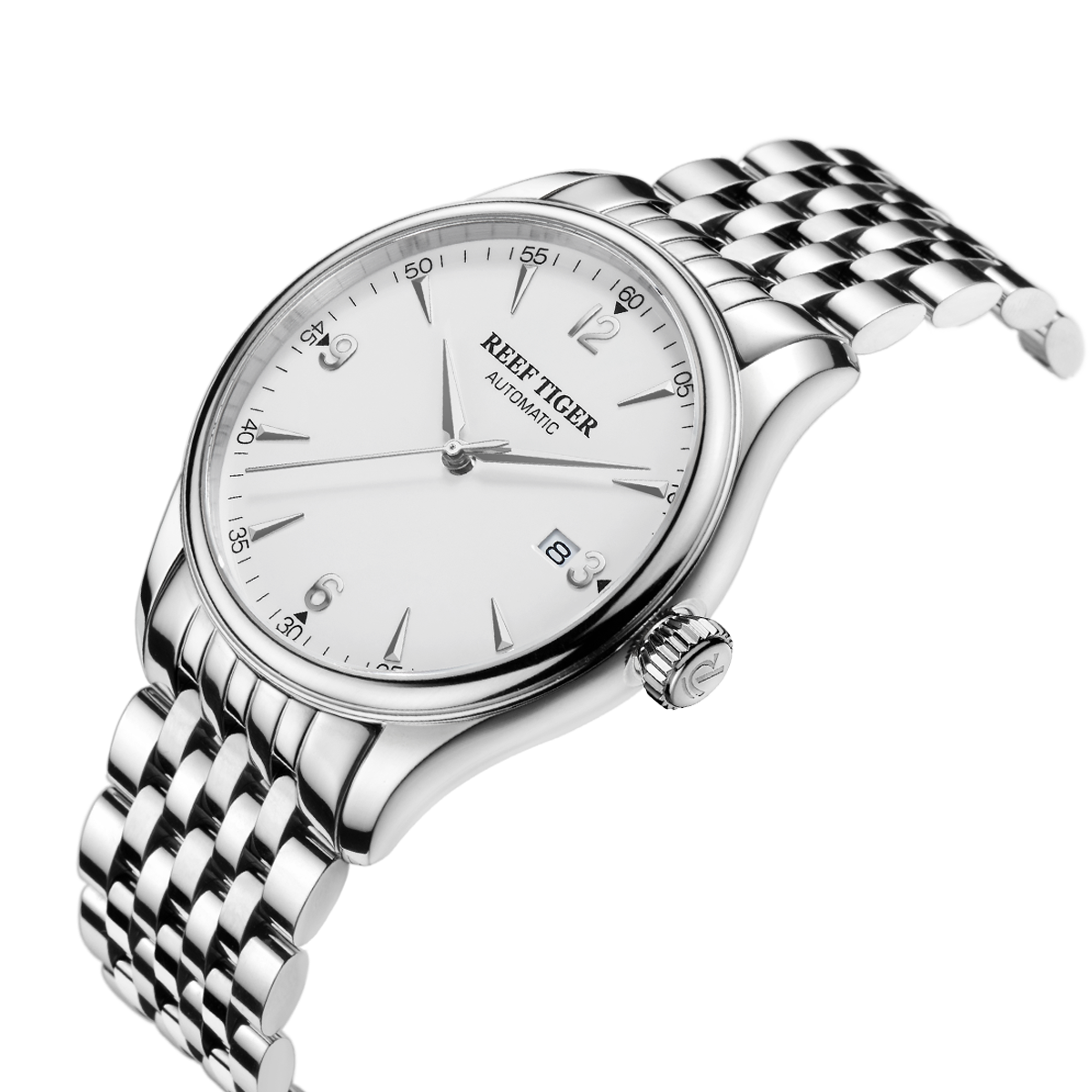 白色表盤,配銀色棒狀和羅馬數(shù)字標(biāo)記。小時(shí)、分鐘、秒和日期顯示。