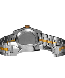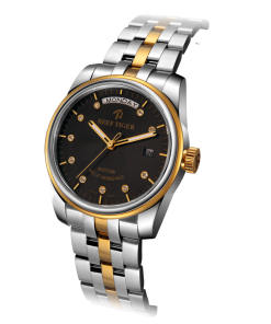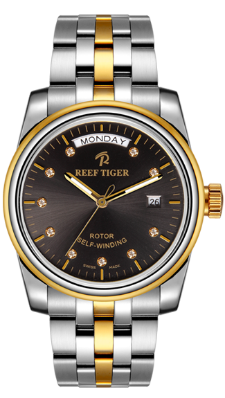 黑色表盤。這款雙色腕表采用經(jīng)典圓形表殼搭配黑色表盤(十顆鉆石和十二個黃金棒狀時標),日期和星期顯示分別位于 3:00 和 12:00 位置。