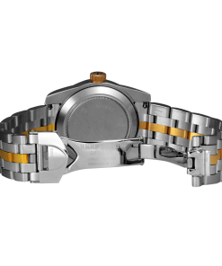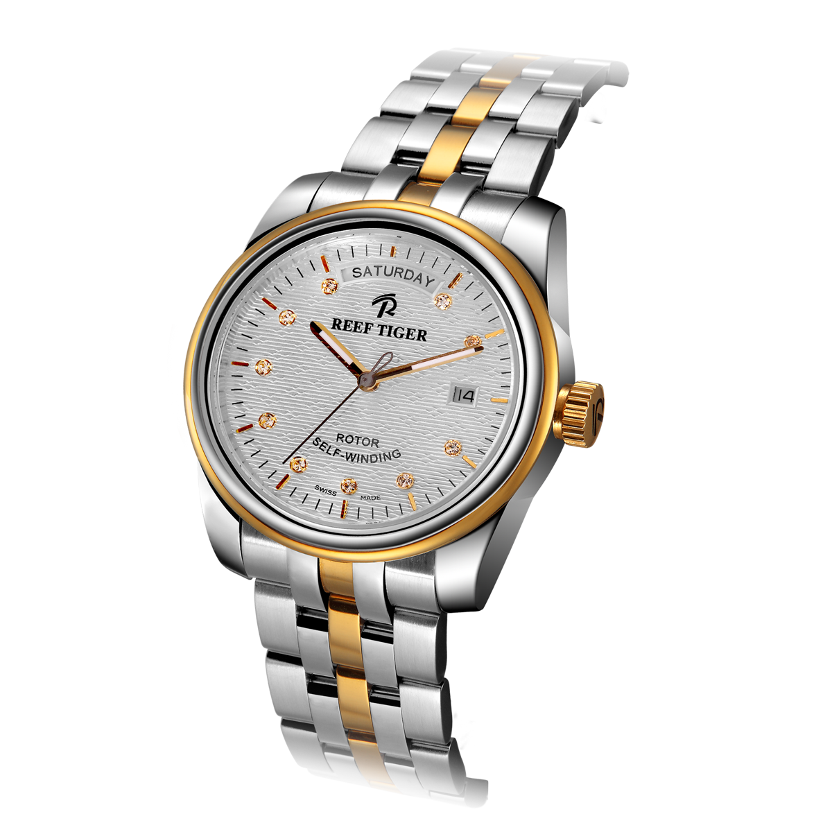 白色星形圖案表盤。這款雙色腕表采用經(jīng)典圓形表殼搭配白色表盤(十顆鉆石和十二個黃金棒狀時標(biāo)),日期和星期顯示分別位于 3:00 和 12:00 位置。