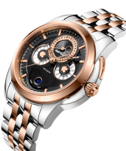 黑色表盤搭配玫瑰金棒狀標(biāo)記。時(shí)、分、秒、日期、星期和月相顯示。這款奢華腕表的表盤 12 點(diǎn)鐘位置印有品牌標(biāo)識。
