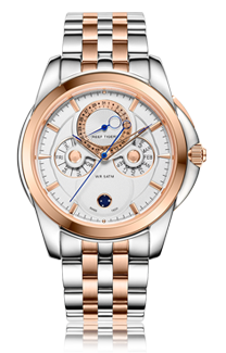 白色表盤(pán)搭配玫瑰金棒狀標(biāo)記。時(shí)、分、秒、日期、星期和月相顯示。這款奢華腕表的表盤(pán) 12 點(diǎn)鐘位置印有品牌標(biāo)識(shí)。