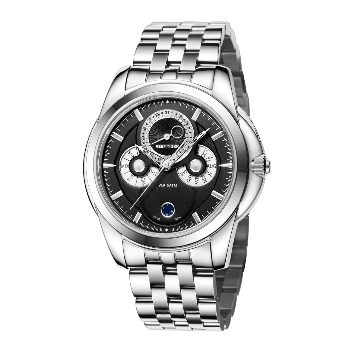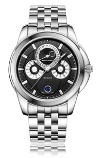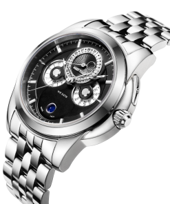 黑色表盤,銀色調(diào)棒狀標(biāo)記。時(shí)、分、秒、日期、星期和月相顯示。這款奢華腕表的表盤 12 點(diǎn)鐘位置印有品牌標(biāo)識(shí)。